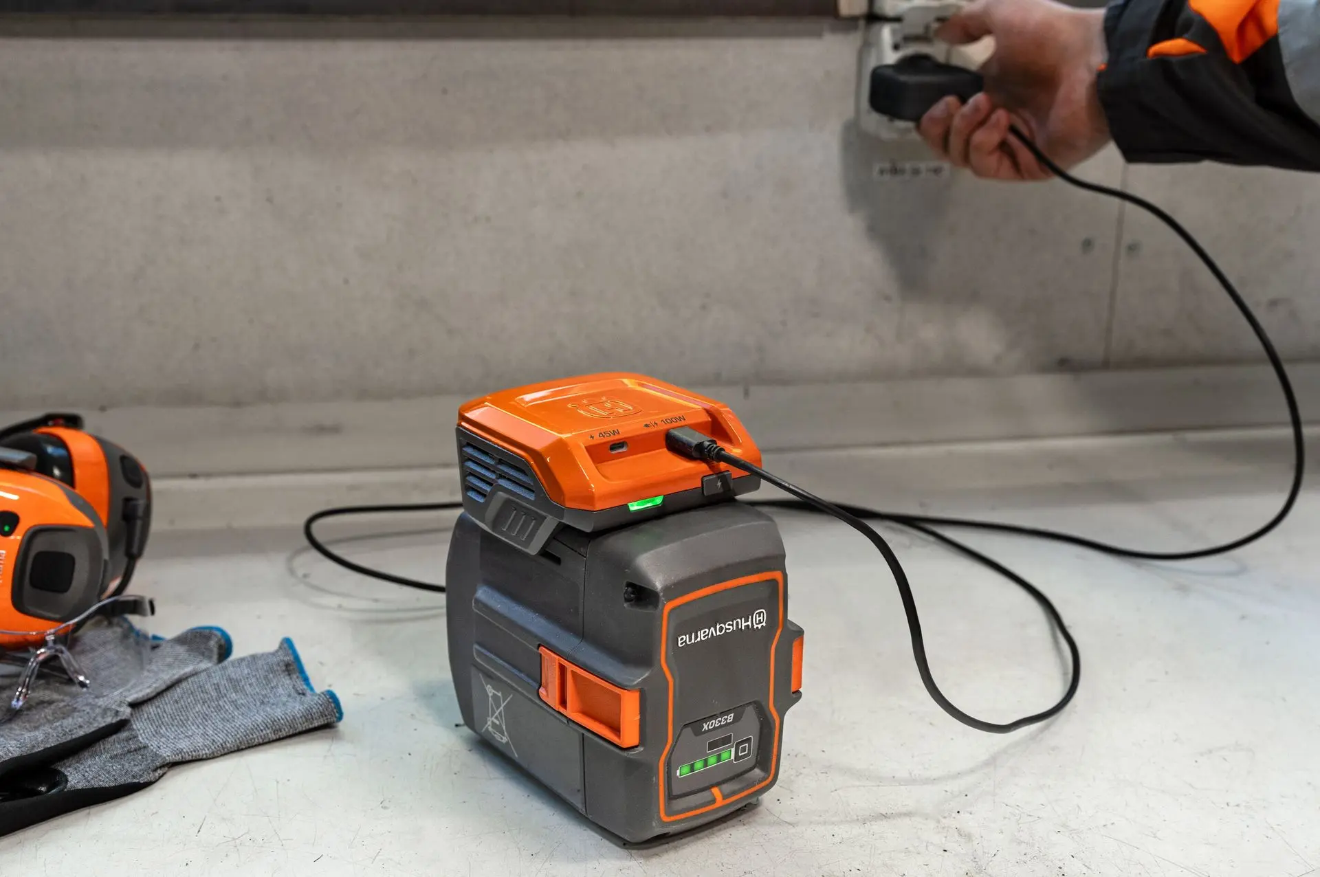 De Husqvarna 40-USB150X is een compacte USB-C-adapter die kan worden gebruikt om uw laptop, smartphone of gehoorbescherming op te laden.